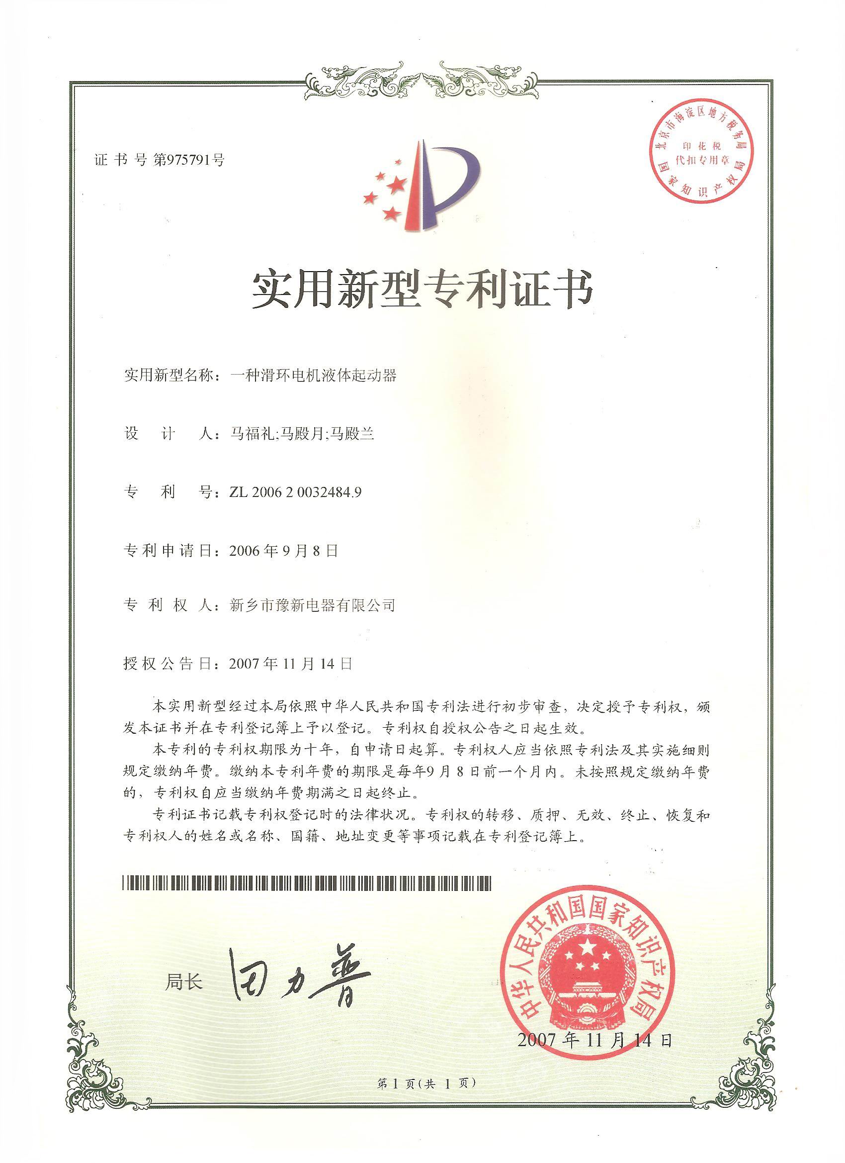 高壓液體變阻器專利證書
